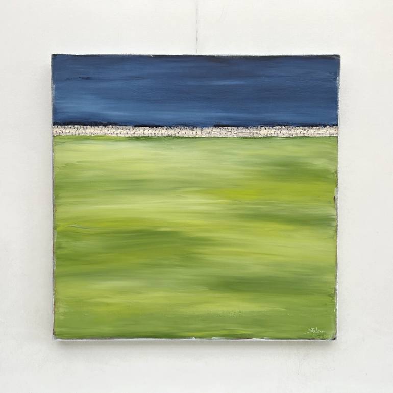 Contemporary coastal abstract modern minimalist beach art landscape seascape painting by Sabina D'Antonio, with navy blue and green colours. Original artwork brings the viewer an adventure in texture with textile, a horizon made with genuine music sheets, and colours inspired when driving along the...