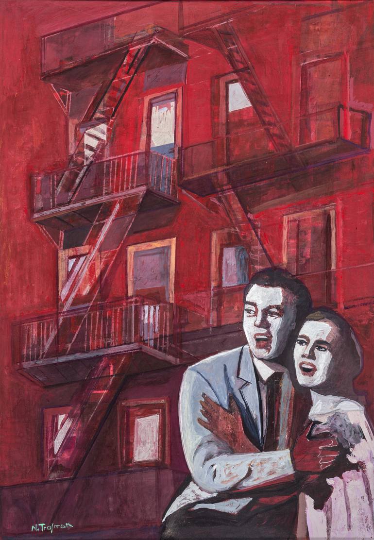 The film West Side Story inspired me a lot. Great dance, great music, great actors. Superb scenography. Superbs urban landscapes .. New york's buildings with stairs and the strong love story of Maria and Tony ! Great urban structure. Technique: tempera that is Pigments mixed with an egg mediu...