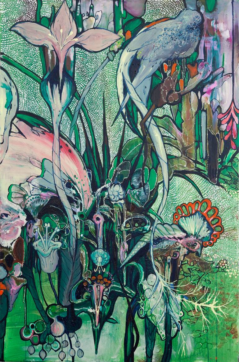 The fusion of organic elements to create an aesthetic that is ornamental but too complex to be merely illustrative. Using visual cues to set of diverse associations, playing on art historical iconagraphy and modern pop culture at the same time.