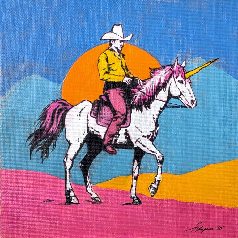 In this world, colors are not afraid to speak loudly. The sky is a deep blue, the fields blaze in pink and gold, and the mountains are painted in calm blue tones. And in the midst of this radiance—a cowboy on a bright pink unicorn, as if from a dream where there are no boundaries between reality and...
