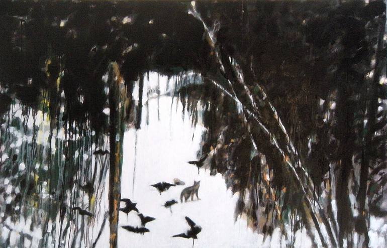 Canadian forest and wildlife motive. I always use acrylic, oil and enamel to create different textures, transparancies and overlays to describe light in nature.