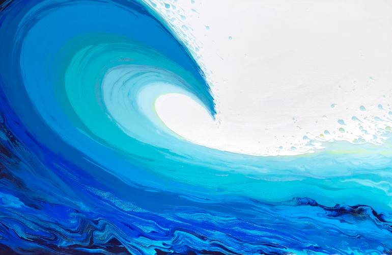 I was born and raised in West Sussex, England and now live with my husband and two children in a beach house just along the coast from Brighton. I am a professional artist and very lucky to be able to paint from my home studio which looks across a pebble beach, straight out to sea. Inspired by the sea….I am a seascape and abstract artist and I create a magnetic visual escape for others to find a sense of happiness, exhilaration, and relaxation. I paint onto canvas using acrylics and then I apply glossy resin finishes to each piece to enhance and create the illusion of glassy water. I remember spending much of my spare time as a child colouring and painting and filling endless sketchbooks with detailed drawings of the Sussex countryside where I grew up. My appreciation of space, beauty and light that began at an early age continued to develop throughout my life. Now that I live on a beach, the stunning, ever changing sea views provide constant inspiration for my contemporary seascape paintings. My home studio is flooded with an amazing quality of light which bounces off the sea all year round. This is uniquely captured in my work through the use of colours, the metallic and pearlised threads of detail and glasslike resin finishes which coat my watery creations. I portray the atmosphere of the shoreline and the endless ocean waves with clean and alluring blues, the movement of the colours, and fascinating compositions. Sunsets, surf waves and underwater coral reefs are beautifully painted in such a unique way that my work has become widely collected. I work magic on my canvas. Each painting has, when you come closer to it, beautiful complexities inside the glassy surface of the medium. My paintings portray a certain energy. Dancing waves crashing against the serene shoreline are many times depicted and successfully achieved. I carefully mix and combine enthralling colours, building up each piece one layer at a time, using my knowledgeable control of the flow of the resin, with perfect touches of hues here and there. I seek to captivate my audience by sharing my constant awe of the unique beauty and magnificence of the sea. When I am not painting waves and the ocean, I create mesmerising abstracts full of movement and energizing colour. Working full time as a professional artist I permanently exhibit at the prestigious and long established Art5 Gallery in the famous Brighton Lanes and am their best selling artist.