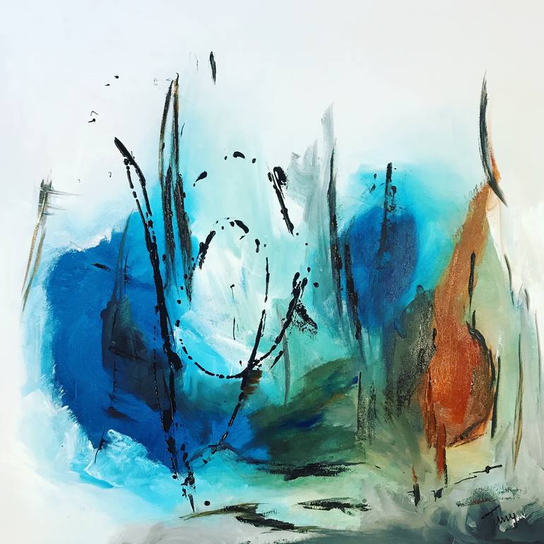 Tiny's paintings depict defining moments in her life, a central theme she has termed, 'Patterns of Life'. The patterns of life tell a story of the different processes and experiences that are so fundamental to human beings. Her inspiration comes from nature, her immediate surroundings and the stories she hears or reads. Her work is abstract figurative, and uses cheerful colours to express her creativity and enthusiasm. She often works with an art scraper, which she uses to scrape sand and paint onto her canvases. Tiny's work is described as uplifting, colourful and dynamic by her collectors She wants her paintings to create a moment where the thinking process stops and the intuition takes over.