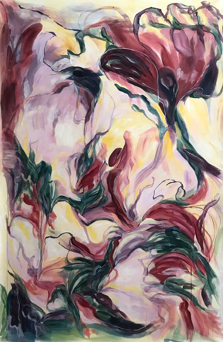 A bold and intense springtime palette, full of yellow and crimson and violet hues. Inspired by the works of Matisse and Bonnard. This series of paintings are on unstretched canvas, and will ship rolled in a tube.