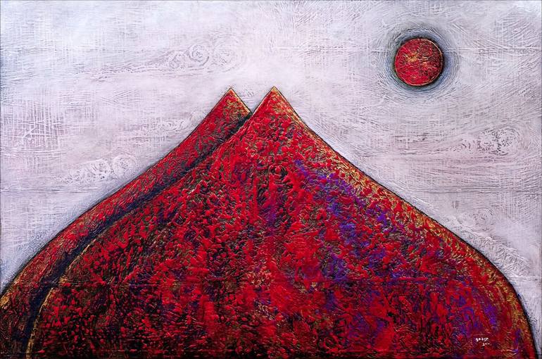 Crimson Peaks is a surrealist and abstract landscape that transports the viewer to an otherworldly domain. The painting features two crimson, onion-shaped domes, whose volcanic surfaces are textured like lava. Behind them, a red celestial moon glows against an ashen sky, creating a sense of powerful...
