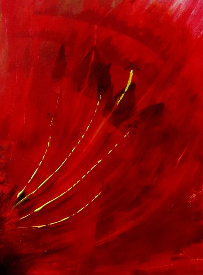 The painting depicts the crimson red hues of the summer flowers, with acrylics on stretched canvas. It's 'Ready to Hang' on arrival.