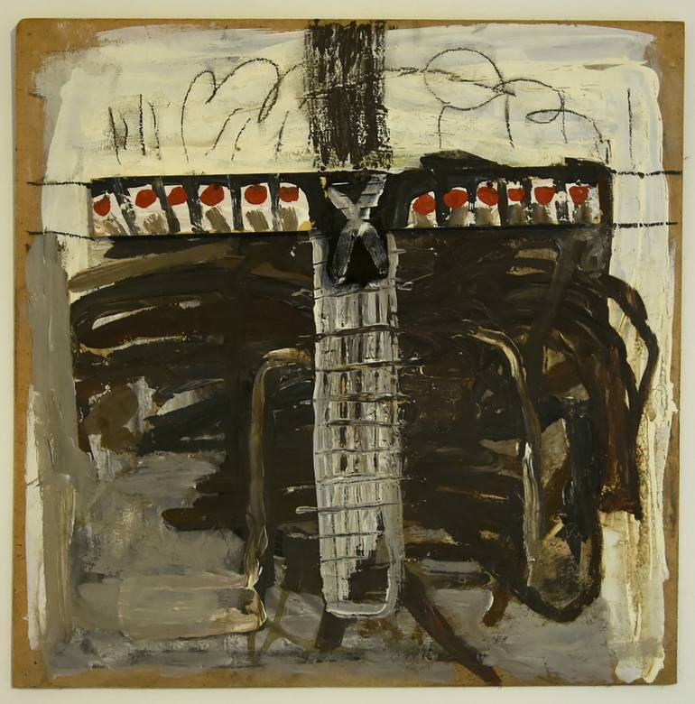 A rugged grey cross is standing on a deathly hill, yet firm over the turmoil and darkness against a bright white sky. This abstract art is a message painted on a rustic board that communicates hope even in times of trouble. The creator has cleverly blended light and dark shades using tangible obje...