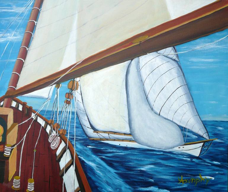 Title: "Crossing Tacks" Medium: Professional grade acrylics on stretched canvas Size: 18X20 inches (46X53 centimeters) Artist Statement: "Crossing Tacks" is a celebration of the timeless elegance and intricate dance of two gaff-rigged sailing vessels as they navigate the vast, ever-changing ocean...