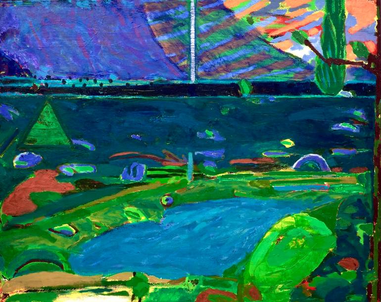 Under a big sky, a small figure in the low foreground center has approached a patch of light just ahead of a lake with an embankment. Our view seems to be from where he may have began, high right side with a large foreground tree on the right edge. Looking down into the painting we survey what app...