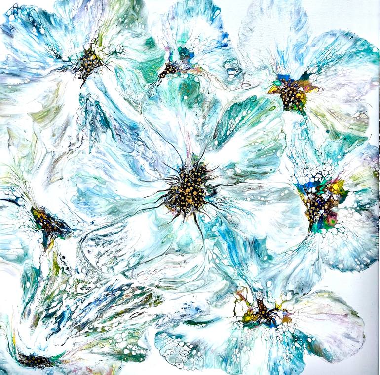 Crystal Blossom is a radiant 2024 acrylic painting by Yurij Pankevich, measuring 90x90 cm. This stunning abstract floral piece captures the essence of delicate blossoms frozen in a moment of ethereal beauty. The painting features soothing tones of icy blue, soft white, and hints of emerald green, ac...