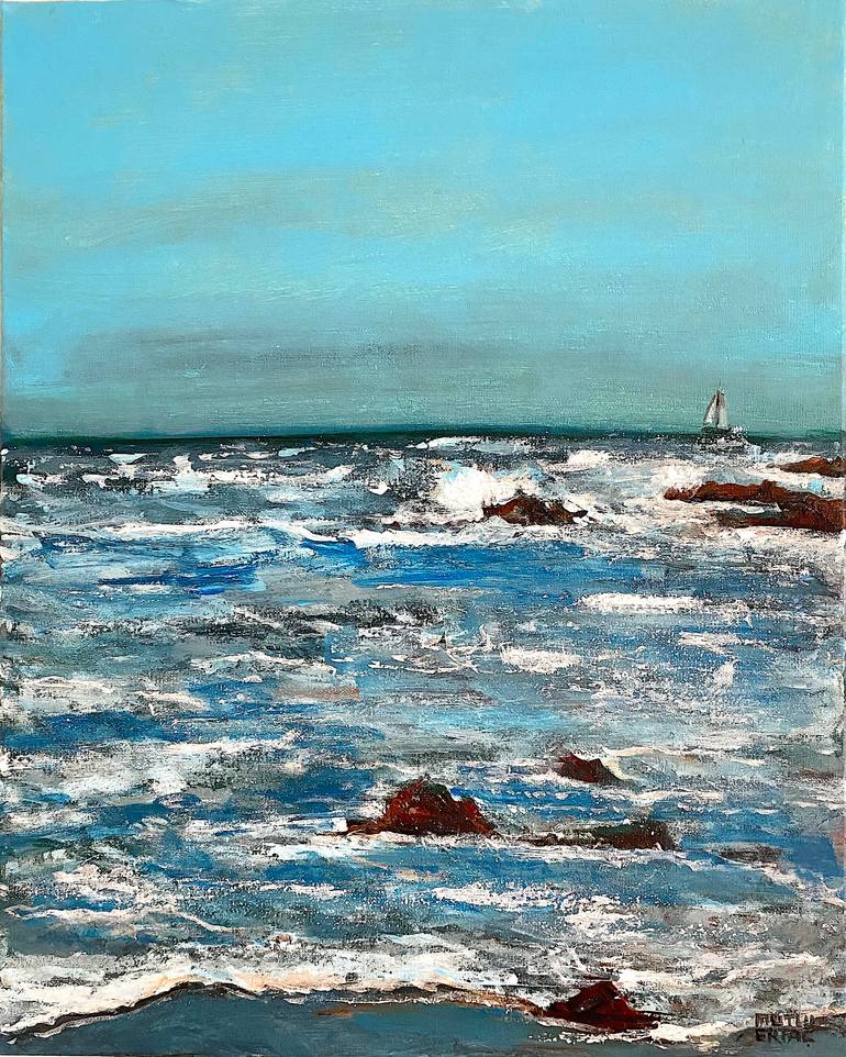 This original acrylic painting captures the serene beauty of Crystal Cove State Beach in California. I was walking at Crystal Cove State Beach in California, and wanted to paint this movement of water, and sailboat at the distance in impressionistic style . Inspired by a walk along the shore, the ar...