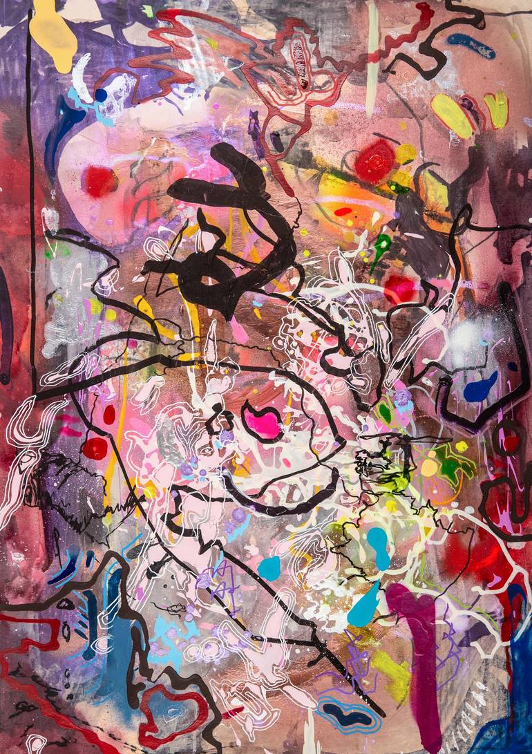Suggestive contours are all that remain of the figurative in this work. The small of a back, the fall of a breast: if you think it is, it probably once was. But what it lacks in verisimilitude it makes up in maximalism. The broad mix of media—everything from phosphorescent paint, ink and graffiti ma...