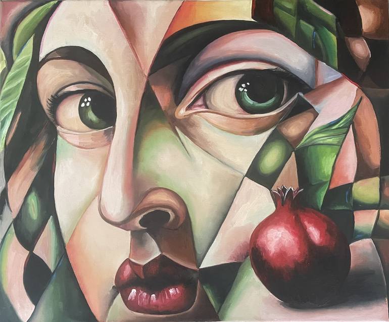 This captivating cubist-inspired oil painting features a powerful female portrait with striking green eyes and a ripe pomegranate — a symbol of beauty, fertility, and tradition. The fragmented, geometric composition reflects the complexity of identity and perception, blending abstract and figurative...