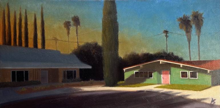 Alex Selkowitz is a fine art oil painter who resides in Los Angeles, CA. After spending decades in the film industry as a lighting technician he has brought his knowledge of light, shadows and composition to his passion of fine art. He is inspired by the bright Southern California light and colorful sunsets. His subjects range from dense urban concrete environments to the sprawl of suburbia littered with green spaces. Common everyday human made objects occupy his paintings which represent the human presence but his paintings typically are devoid of any humans. Painting in an impressionistic style his artworks evoke a calm liminal feeling and a dream like quality.