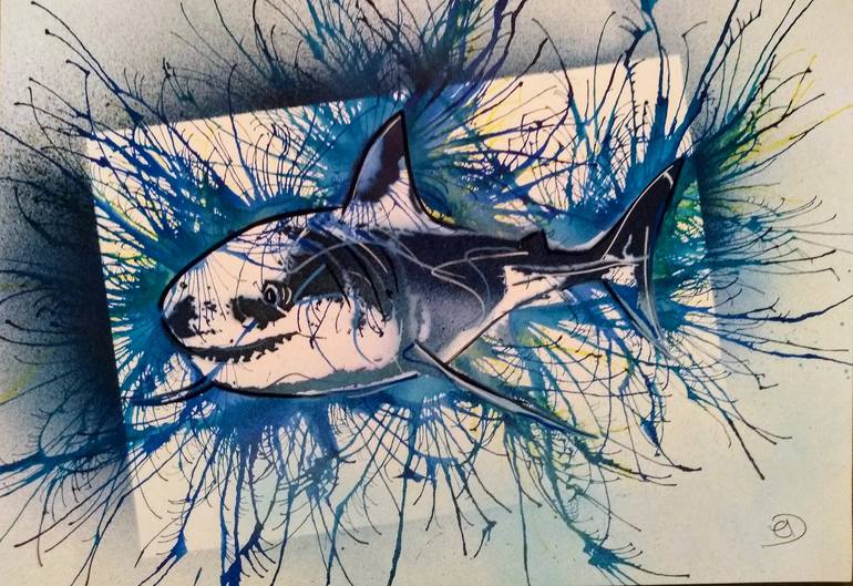 This is a spray paint stencil, pen and ink drawing of a Great White shark. It is an original art piece, not a print, signed and dated. I create multiple pieces with the same stencil but each is unique, you will receive the one pictured. This painting is created with archival quality inks, on good q...