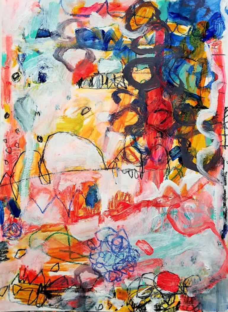 This is a fun painting with acrylic, colored pencils and inks on paper. The linear mark making and swirls are very random and intuitive . The inspiration is the celebration of life in all its colorful forms.
