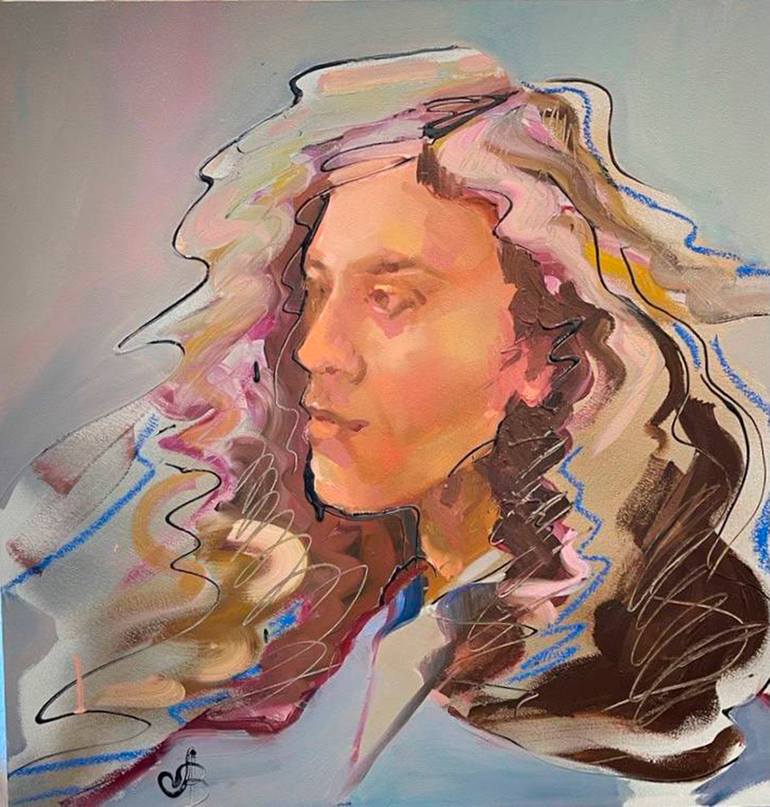 Curly. This work is my creative experiment, where I try to find this fine line between creative freedom and complete disorder. When this succeeds, then the works take on new meaning and content. The painting is done in mixed media using oil paints, outline, and pastels.