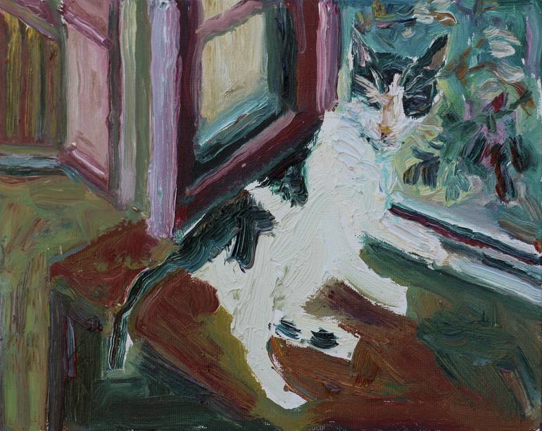 Plein air (painted on location) oil painting of Cusco the cat sunbathing.