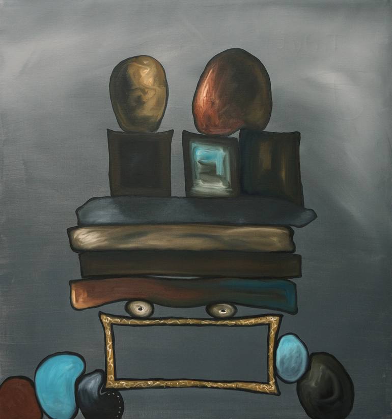 Cushioned is a modern abstract painting with figurative and surreal elements. This work is created on linen with Old Holland acrylic and oilpaint and will come with a Certificate of Authenticity. All paintings are signed at the back.