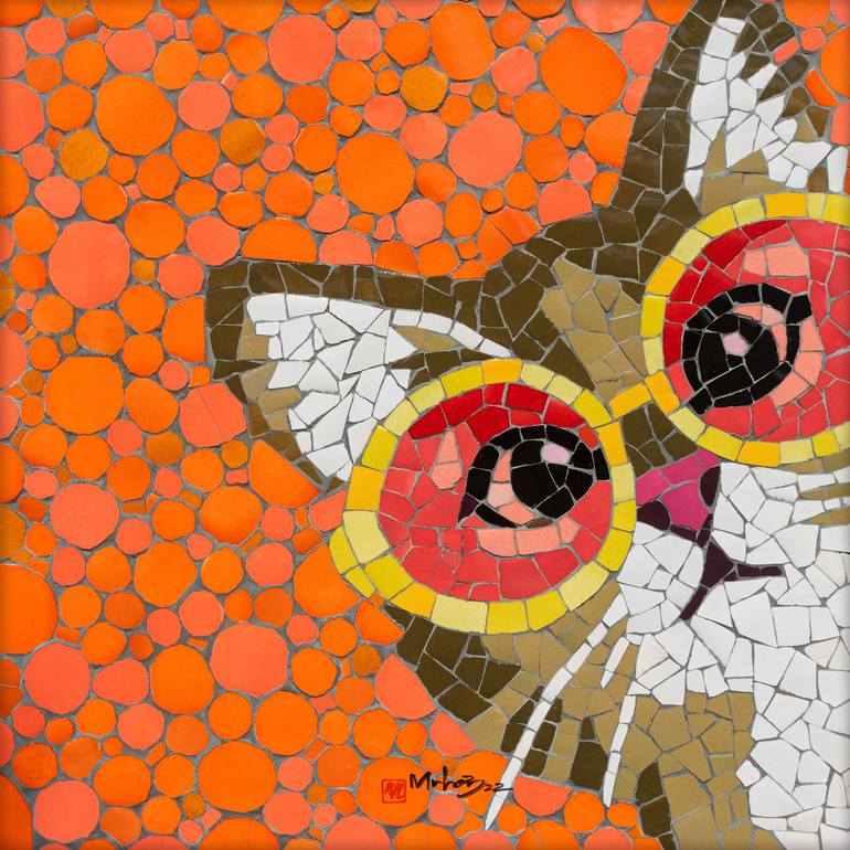 Cute little cat wearing glasses showcase the humorous side of cats, capturing their playful antics and mischievous behavior. The painting was created by artist Mai Nhon, using the technique of ceramic tile mosaic.