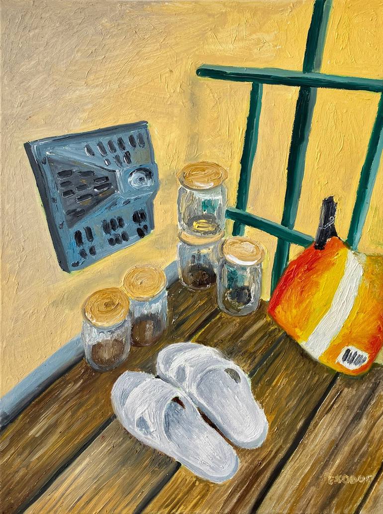 Balcony in February - clear and empty. Czech hitting system. I've drunk all wine I had in these jars from my mom, I can't throw them away.