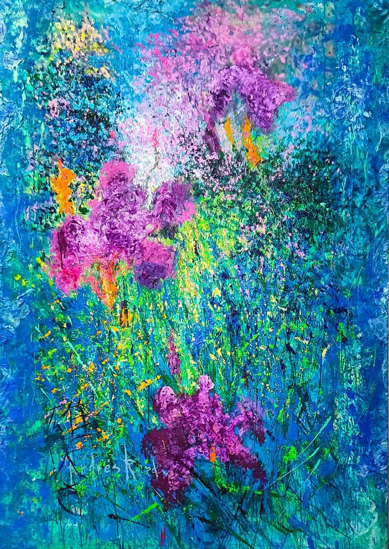 In this work, I have fused expressionism and fauvism to capture the effervescence of nature. Through bold brushstrokes and a vibrant palette, I have sought to convey the emotional intensity and living essence of a wild and ethereal garden. Each stroke of acrylic is a sigh of passion that invites the...