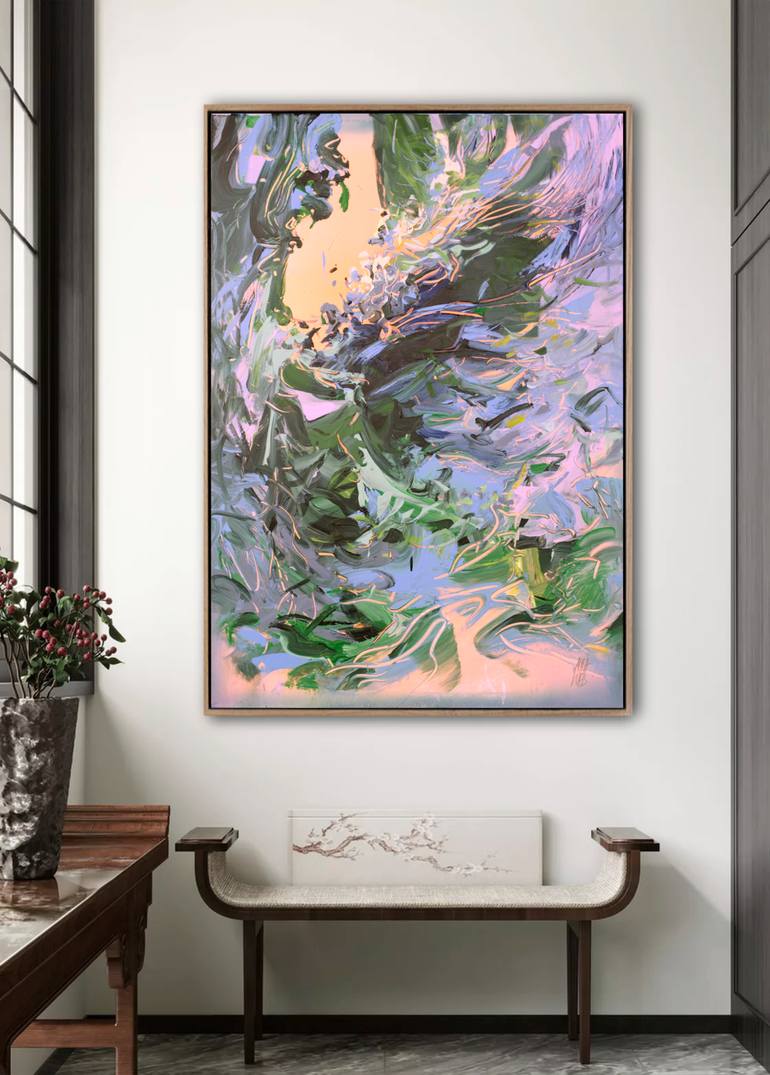 The colors dance like a feverish melody on the canvas, each brushstroke a heartbeat, an emotion that forces its way to the surface. Golden, orange tones flare up, mingling with deep purple and glowing red, as if the sky itself were on fire. Between the brushstrokes lives a longing that strives towar...