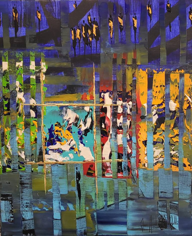 ABSTRACT PAINTING, THE SILHOUETTES GIVE TO THE ARTWORK A FIGURATIVE AND HUMAN TOUCH. ACRYLIC ON CANVAS, PAINTED WITH PALETTE KNIVES, EDGES PAINTED IN BLACK, HIGH QUALITY VARNISH, READY TO HANG. SIGNATURE ON THE FRONT AND AT THE BACK OF THE ARTWORK, CERTIFICATE OF AUTHENTICITY PROVIDED. DETAILS OF...