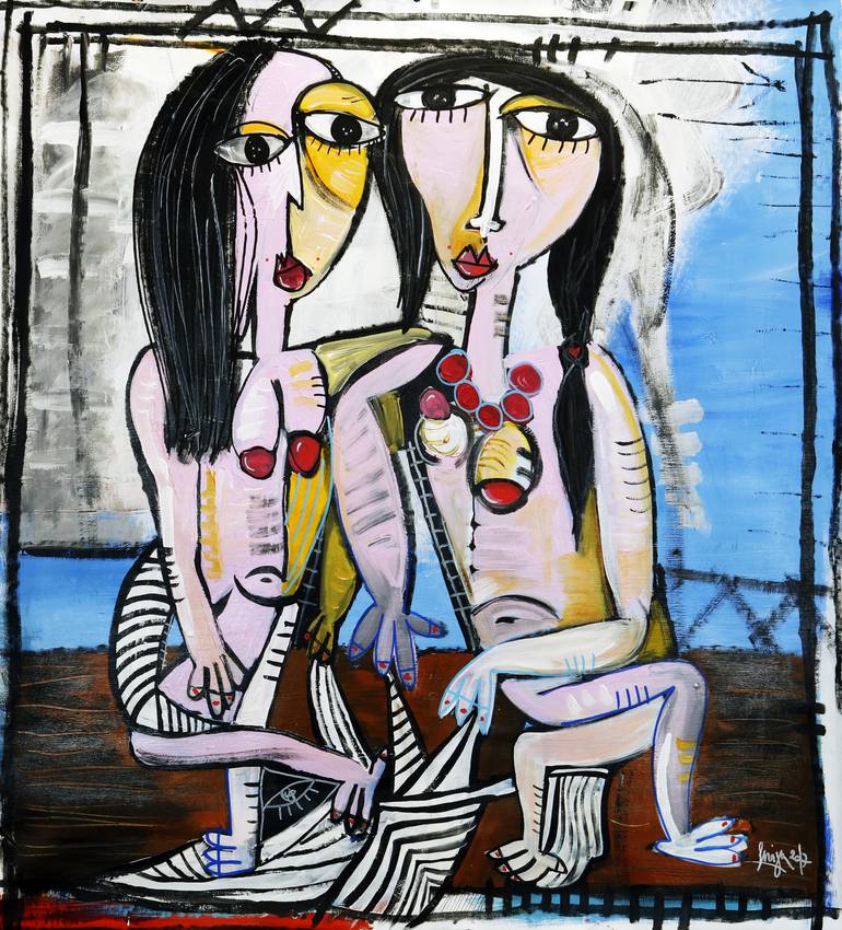 Original painting, individual single piece, oil and acrylic on canvas, Siviglia 2017 Size: 100×80 cm, INCH: 39,3×31,4″ The painting shows two nude women with black hair on a blue background.