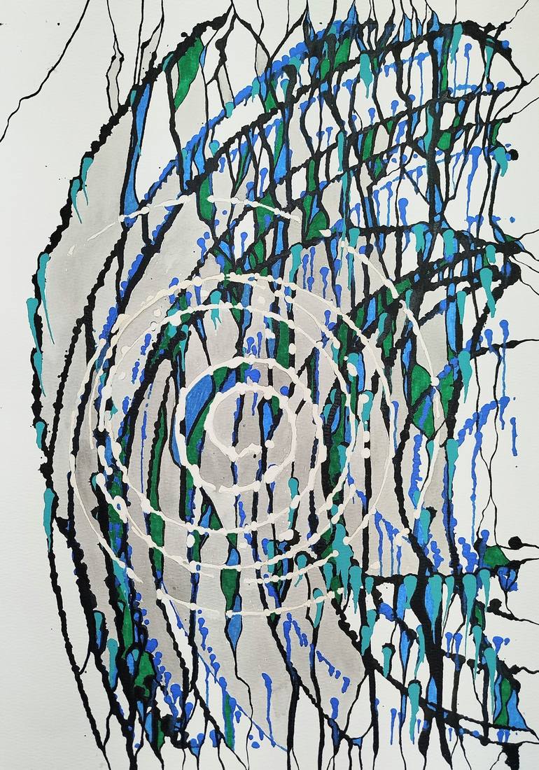 Imagine geometry dancing with nature’s breath: white circles, like ripples on water, float through waves of blue-green chaos. Fun fact: I crafted the background texture not with brushes, but cardboard scraps — the lines became sharp, like cracks in ice. The deep blue here isn’t just a color; it’s a ...