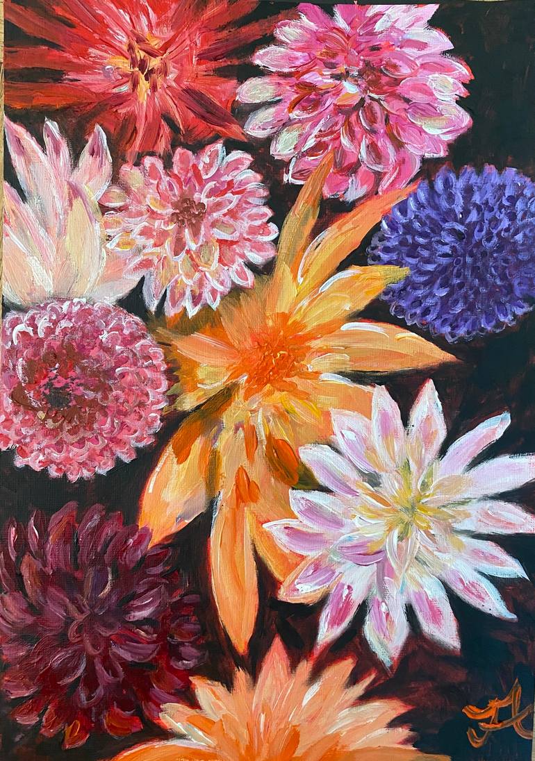 Dahlias are my favorite flowers to paint as they come in so many varieties and allow you to use a freestyle manner that is very satisfying to paint.