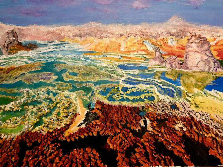 I was inspired by a photo of Dallol. I found this landscape fantastic and colorful. I used sand-texture medium to give similar effect of the landscape.