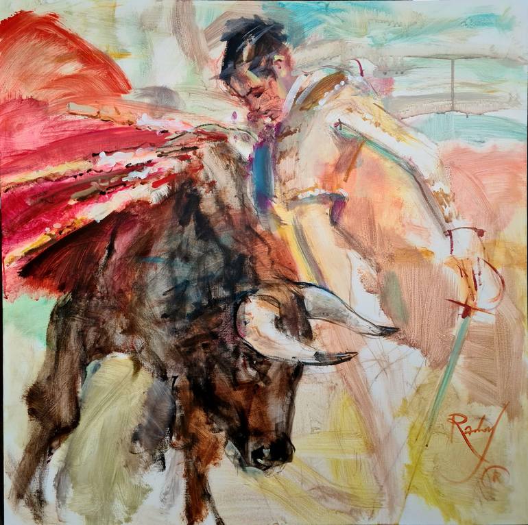 The canvas comes alive with a moment of passion and strength: the matador, dressed in white and gold, gracefully dodges the bull’s swift charge, as if dancing on the edge of life and death. Sunlight glimmers across the arena, illuminating the dust kicked up by hooves and adding drama to every moveme...