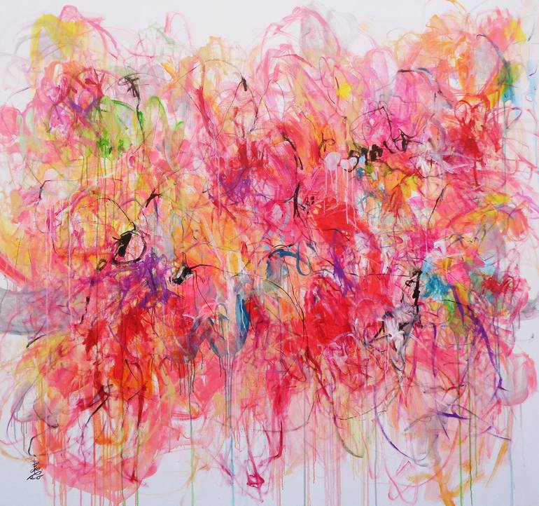 Title: Dance with Joy Size: 154 x 160 cm Painting: Acrylic on Canvas Year Created: 2020 The image shown is the visible area after being framed. There is about 5 cm extra canvas (painted) on each side for stretching. *This painting was stretched on stretcher bars while exhibited at a museum. It wi...