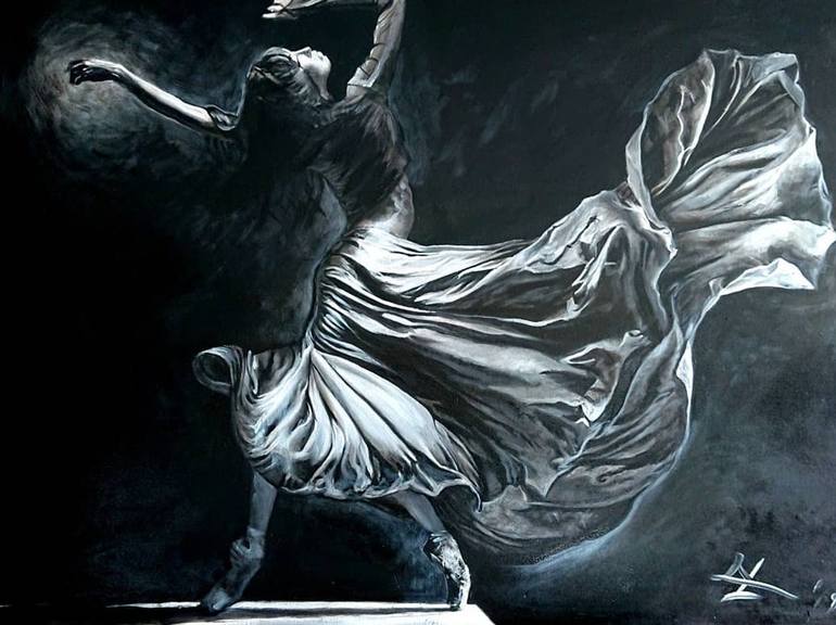 Large oil on canvas painting of a girl dancing at night. Her dress shimmering in the wind.