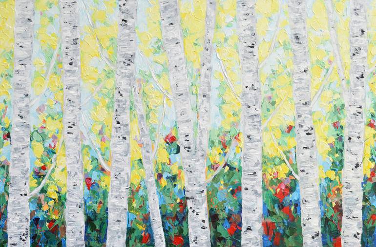 Heavily textured painting of paper birch trees in the fall in New England.