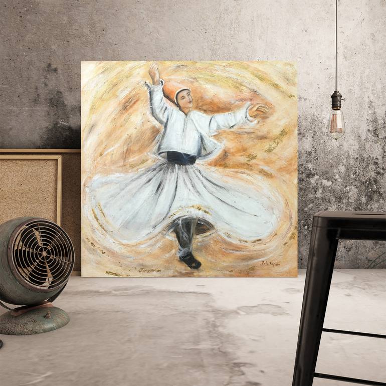 Sufi whirling is a form of physically active meditation which originated among certain Sufi groups, and which is still practiced by the Sufi Dervishes. The painting depicts the joyous abandon of a Sufi dervish as he whirls in a meditative trance. The dervishes hat is a contrasting orange tone with...