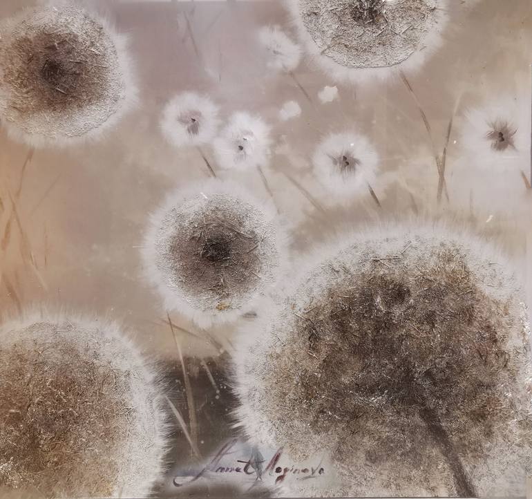 This large abstract painting features a play of textures: oil & acrylic paints, dried herbs. You can feel the rich textured surface with your fingertips. The painting in brown pastel colors depicts tender dandelions in the wind. This artwork would be a stylish and gorgeous decoration for modern ...