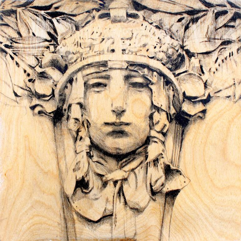 When painting, headdresses and crowns deify Kate Kelton’s subjects. She uplifts the Unsung Sheroes & Heroes, Patriarchy Smashers, Warrior Survivors, Silence Breakers, Philosophers, Truth-Tellers, Whistle Blowers and Thought Giants of all stripes. She paints her portraits cloaked in the garb of statues Ladislav Šaloun sculpted onto the train station that her great-grandfather, Josef Fanta, designed for Prague in 1901 - 1909. Apotheosis through a reclaimed, reapplied Art Nouveau. Sampling her own lineage, she transforms a historical body of work, itself a thing of lasting beauty; exchanging granite for graphite, plaster for paint. In Photoshop, she first combines the desaturated faces she's found, sourced or shot of her chosen subjects, with the black and white photos from her family and friends, of the statues in situ. Then she uses graphite, inks and acrylic paints and glazes to create the works on panel or canvas, literally uplifting and elevating her battle-weary subjects to the highest reach of architectural strata. 'Ancient and distant godlike beings, surveying a dying empire, trade places with the fresh blood of her subjects. The work presents a tactility against the digitized space, and represents a taking, an acquisition of power back from the tastemakers. Here, the mantle of the artist is above brand influencer, above internet commentator, above mere marketability. In their gaze is a warning, “Art is immortal. Come for me, why don’t you?”' ~ Micah Chaim Thomas "Kate's recent work is a matter of expansion through contrast - she is as ephemeral as her subjects are concrete architecture; she is structural when her subjects should slip through your fingers like too-fine sand. Taken as a whole, the works in her magnificent series Sentry are incredibly intelligent, but when looked at individually, you come to understand that these are statements of life beyond themselves. The series take embellishments of a Prague train station designed by her great-grandfather, Josef Fanta, and combines these with portraits of women who have stood against the sexual harassment and assault rampant in Hollywood. These women, like Kate herself, have suffered in the era where powerful men, every bit as immovable as the train station, wielded their power without check. The portraits emblazoned on architectural elements, they are marked against the edifice, every bit as permanent, and perhaps even more defining.