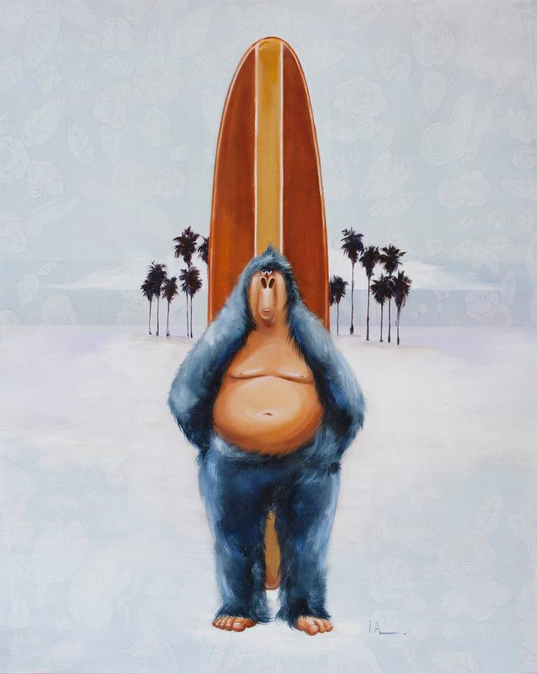 My gorillas are the uncensored human, laying bare a primitiveness we can all relate too. In a culture defined by the media’s constructed images, idolizing our super stars, we have been led to equate being aesthetically pleasing with personal satisfaction. Despite their large hairy bodies and prominent nostrils, the gorillas redefine super star. Poised in the nude, they greet you with genuine self-confidence in who they are. I also take my work to the public space, painting murals in the streets of Los Angeles and beyond, so they exist within our “civilized” environment, and remind us to be at peace with our own human nature.