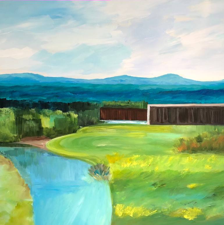 I am inspired by the forms, lines and colours of our natural world. This is my abstract interpretation of a garden in Charlevoix, Quebec. I wanted to saturate the colours to make the serene landscape with the surrounding mountains, vivid and bright and bring out the freshness of summer.
