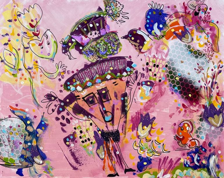 With my art I want to make you smile. My paintings radiate joy and ease. Together with the stories I write for the big formats they stimulate your fantasy and invite you to step into my playful world. (Mit meiner Kunst möchte ich Sie zum Lächeln bringen. Meine Bilder strahlen Freude und Leichtigkeit aus. Zusammen mit den Geschichten, die ich für die großen Formate schreibe, regen sie Ihre Fantasie an und laden Sie ein, in meine spielerische Welt einzutreten.) Hello, I am Suraya Baumeister, born and raised in Heidelberg (Germany) in 1976. I studied landscape architecture in Kassel and Palermo and after living in Karlsruhe for a few years, I moved to Switzerland, to Lake Maggiore in 2010. During my studies (1997-2004) I started to paint abstract, preferably with a spatula. My individual painting style started to form in 2017. The abstract paintings I do are acrylic/mixed media on canvas. I paint them intuitively. Through the abstract painting I get inspired to draw the faces, figures, mythical creatures and elements. What stories do you see in the paintings?