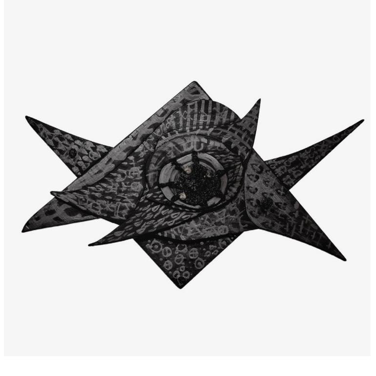 This series is inspired by stars and the vast blackness of space., and Sun Ra. This piece is made in a 1/8" plywood support with layers of plywood shapes, black and dark silver acrylic, graphite and crushed coal.