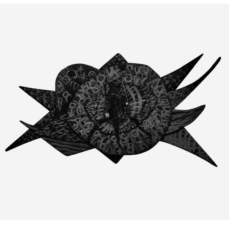 This series is inspired by stars and the vast blackness of space., and Sun Ra. This piece is made in a 1/8" plywood support with layers of plywood shapes, black and dark silver acrylic, pyrite, graphite and crushed coal.