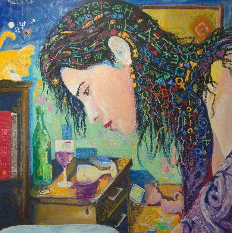 Date Night Spilled wine, a domino, deck of tarot cards and bra in the corner. One can only imagine what's going on here, the cat is surely wondering... Textured ground, oil painting and oil pastels Measures 36 x 36 x 1.5" (91 x 91cm) sides painted black Signed on her "sleeve" and en verso Ready to...