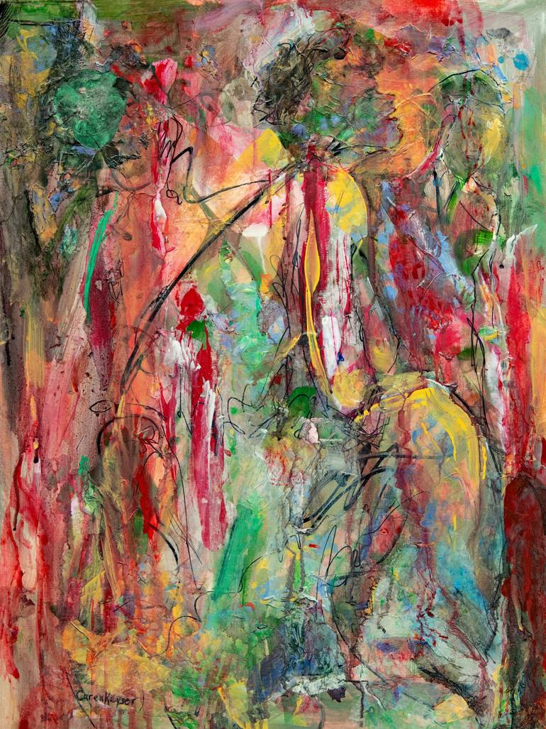 Caren Keyser draws her subject from the paint itself, working intuitively from her imagination. The colors in her acrylic paintings are rich and vibrant. They flow across the canvas or paper creating an excitement in the abstract lines and layers that embody her style. Within that field of color Ms. Keyser discovers her subject. Much like a sculptor she reveals the figure bit by bit until all the components of the work settle into place for the finished piece, and when that artwork tells a story or expresses an emotion it is perfection. Meanwhile she experiments with new materials and methods always honing her skills for her dominant style. Collage, photography and drawing from the model are other techniques Caren enjoys. She often paints on canvas, but works more often on paper or Yupo, a glossy synthetic paper with a smooth plastic surface that she enhances with a final glossy coating. Her career began in the 1970’s after studying art at Florida Atlantic University. Her style then was very realistic yet always modern. She has moved from painting nature to painting figurative works, and has moved from painting very large to painting smaller more expressionistic pieces.