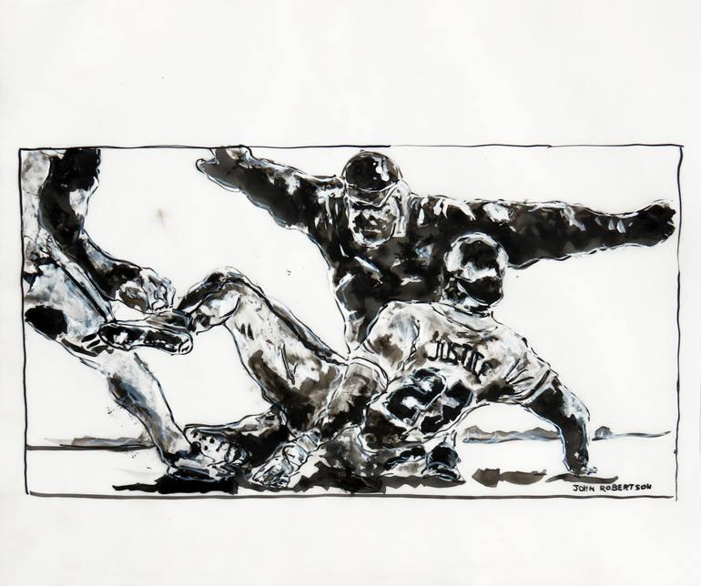 This David Justice of the MLB Atlanta Braves is one of the preliminary art pieces I created for three, 15 foot paintings was commissioned for the MLB Atlanta Braves Truist Park stadium. The overall size of the painting/drawing is 14' by 17” The material is ink and acrylic on drafting film . The act...