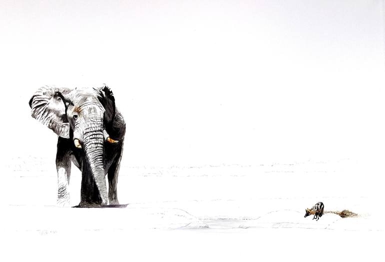 As in the animal kingdom so too do we face our adversaries. Like this jackal making a stand with an elephant so too can we face our daily challenges. The minimalist approach together with the tension between the two animals create an engaging story.