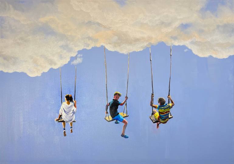 In this painting, I captured a moment elevated from everyday life into a realm of serene whimsy. I used acrylics to blend impressionist skies with the crispness of fine art in depicting three figures swinging towards a boundless azure. It's a tribute to the joy and lightness of being, a reminder to ...