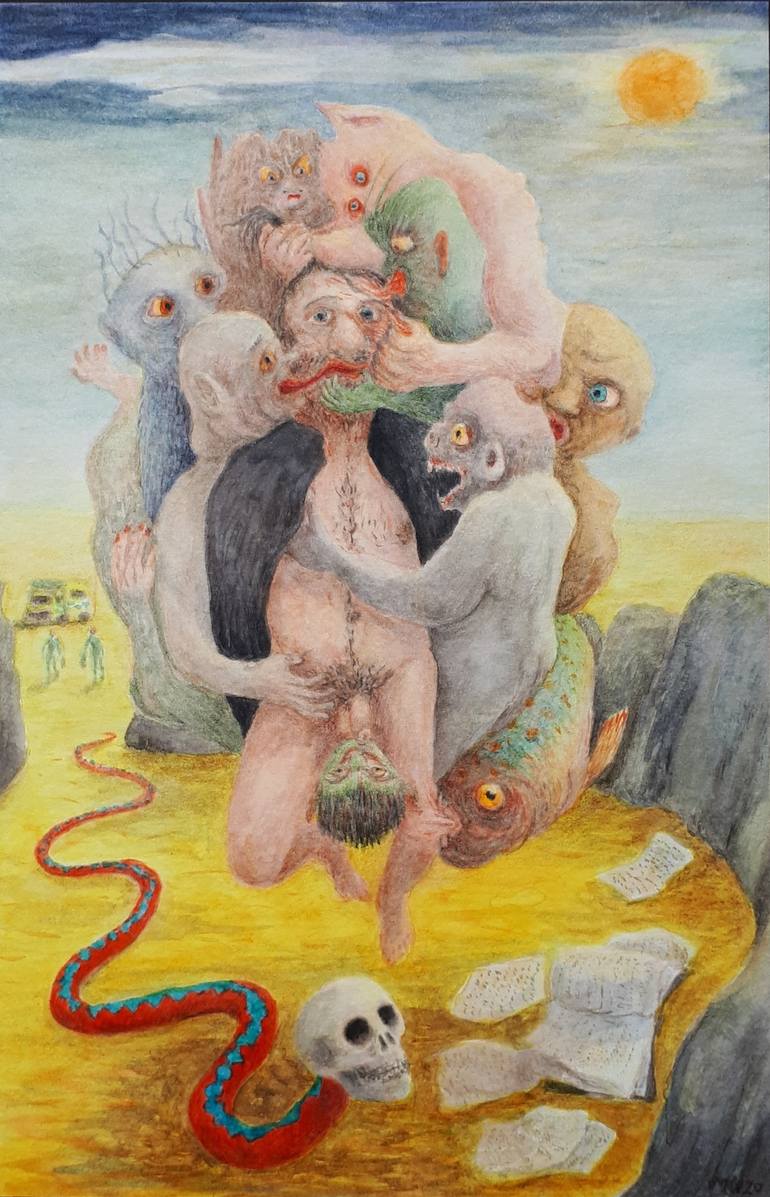 This painting is one of my "Death" series, in which death is personified as a serpent with a human skull head. This refers to the biblical image of Satan as a serpent in the Garden of Eden. In modern terms his role is as the educator of humankind into deeper consciousness, the price of which is fre...
